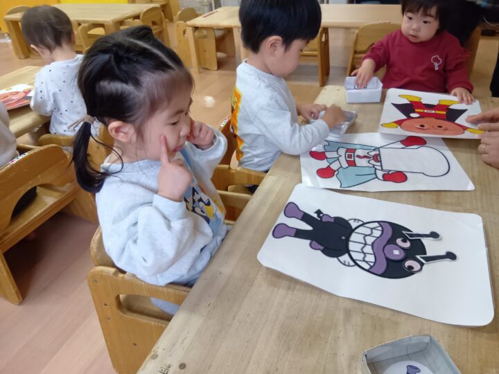 以前までは台紙からシールを剥がすことに苦戦していたひよこ組さんでしたが、今では自分で台紙を折り曲げ指を器用に使い工夫して剥がしている姿があります。