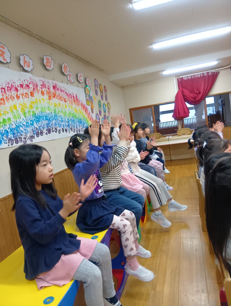きりん組の子ども達は、ステージの上から発表を見て手拍子したり、「かわいい!」「おもしろ~い!」と声をあげて喜んだり、とっても楽しいお別れ会になりました。