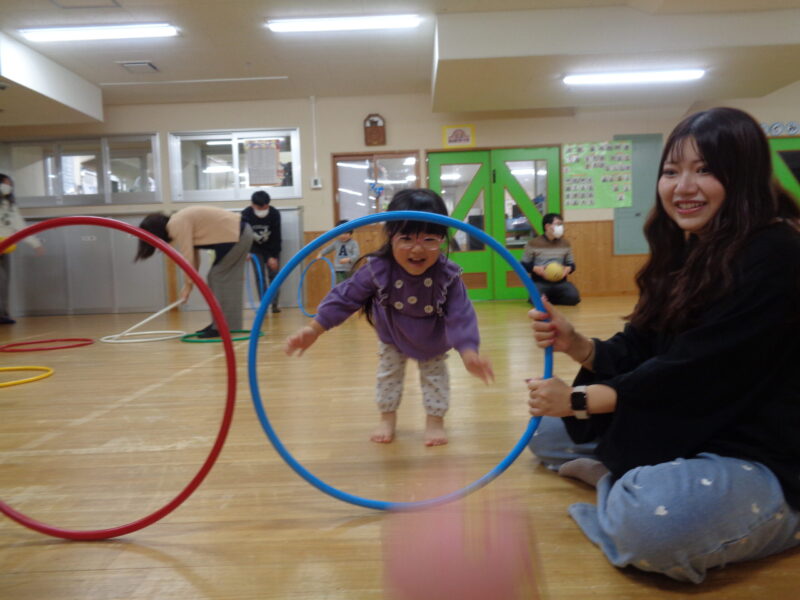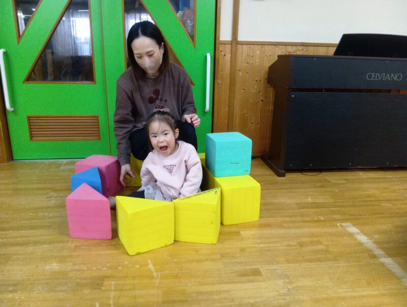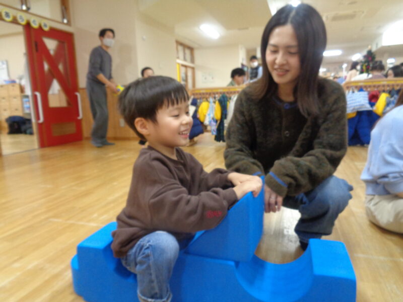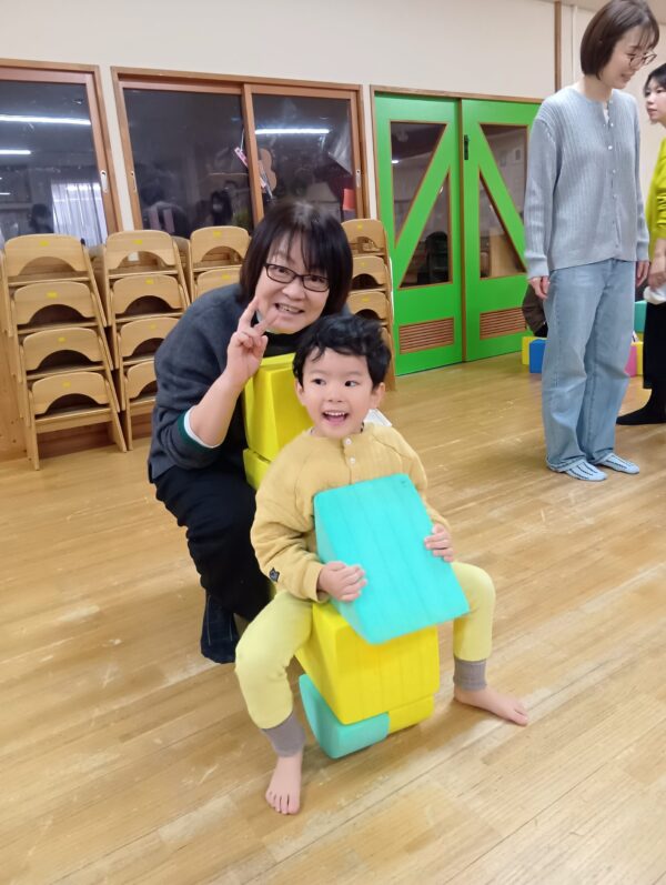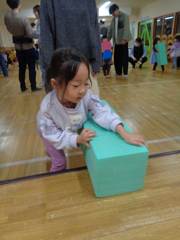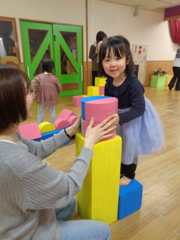 その後は、ソフト積み木、フラフープ、ボールを使ってお家の人と一緒に子どもたちの好きな遊びを楽しみましたよ。