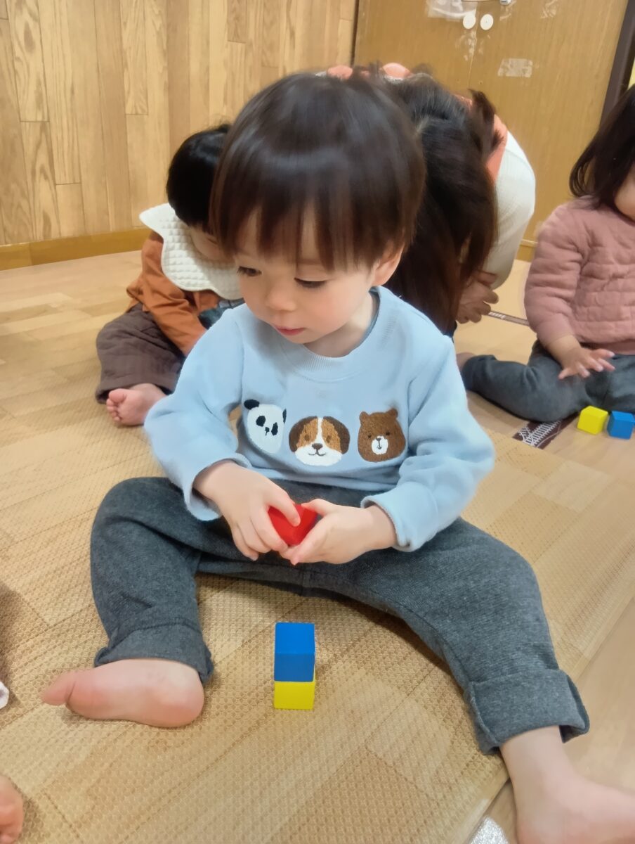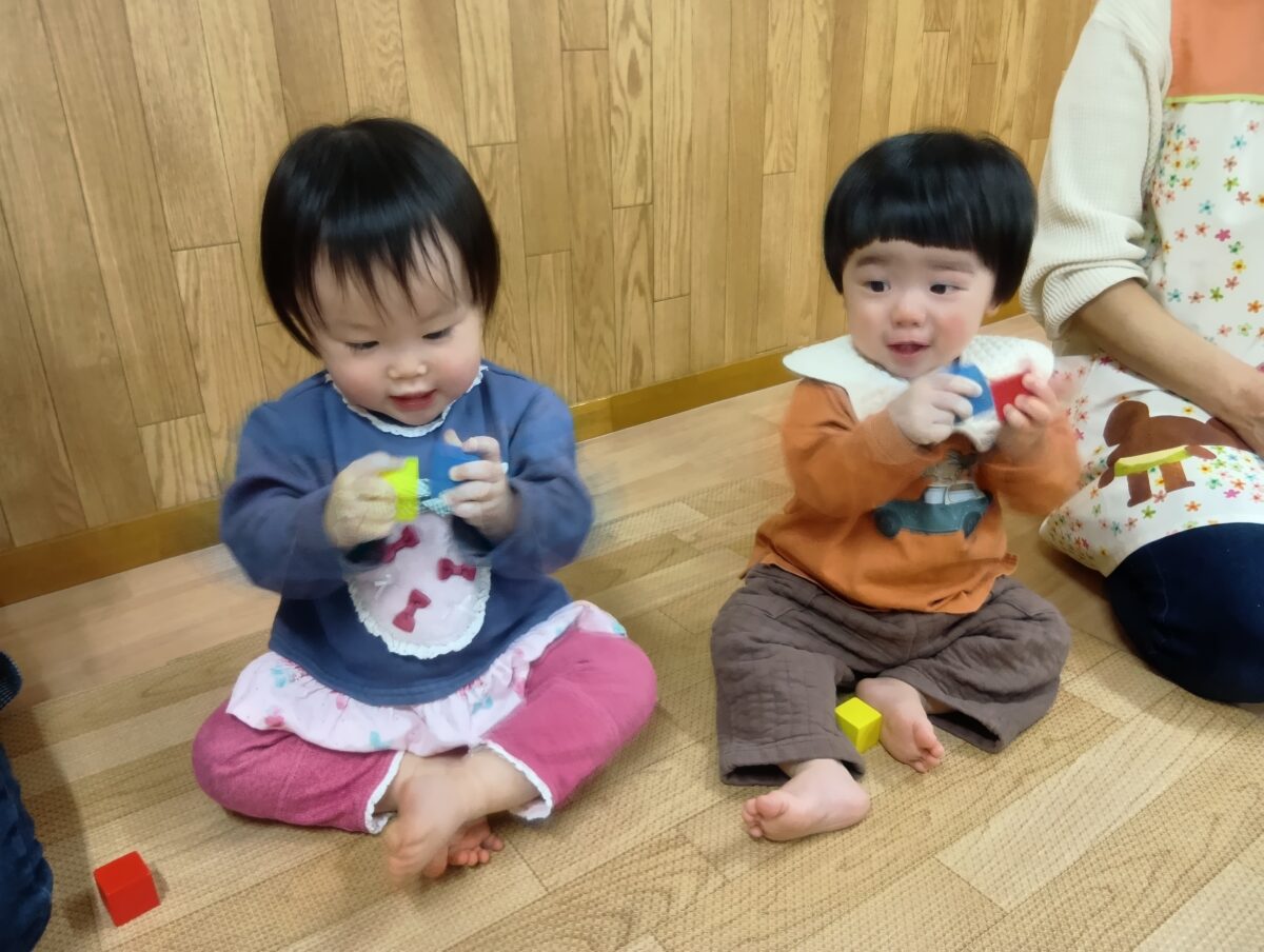 1人の子が積み木をたたいてカチカチと音を奏でると、隣に座っていたお友だちもいっしょにカチカチッ♪