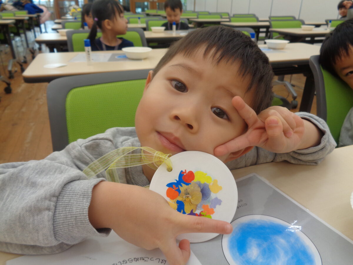 押し花メダルは食育花育センターで職員の方に作り方を教えていただきましたよ。