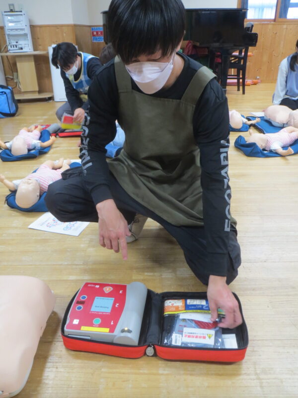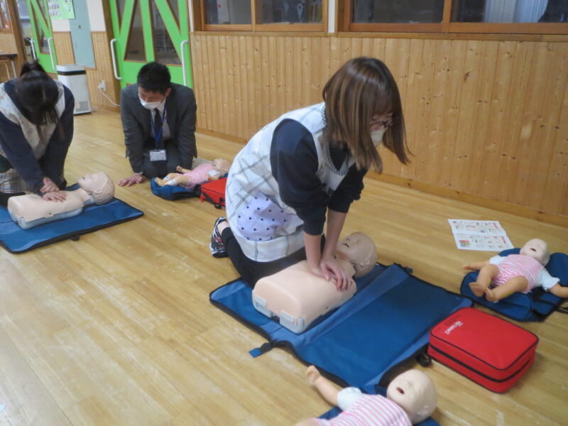 いざという時のために、乳児・小児の心肺蘇生法のやり方やAEDの使い方をみんなで再確認しました。