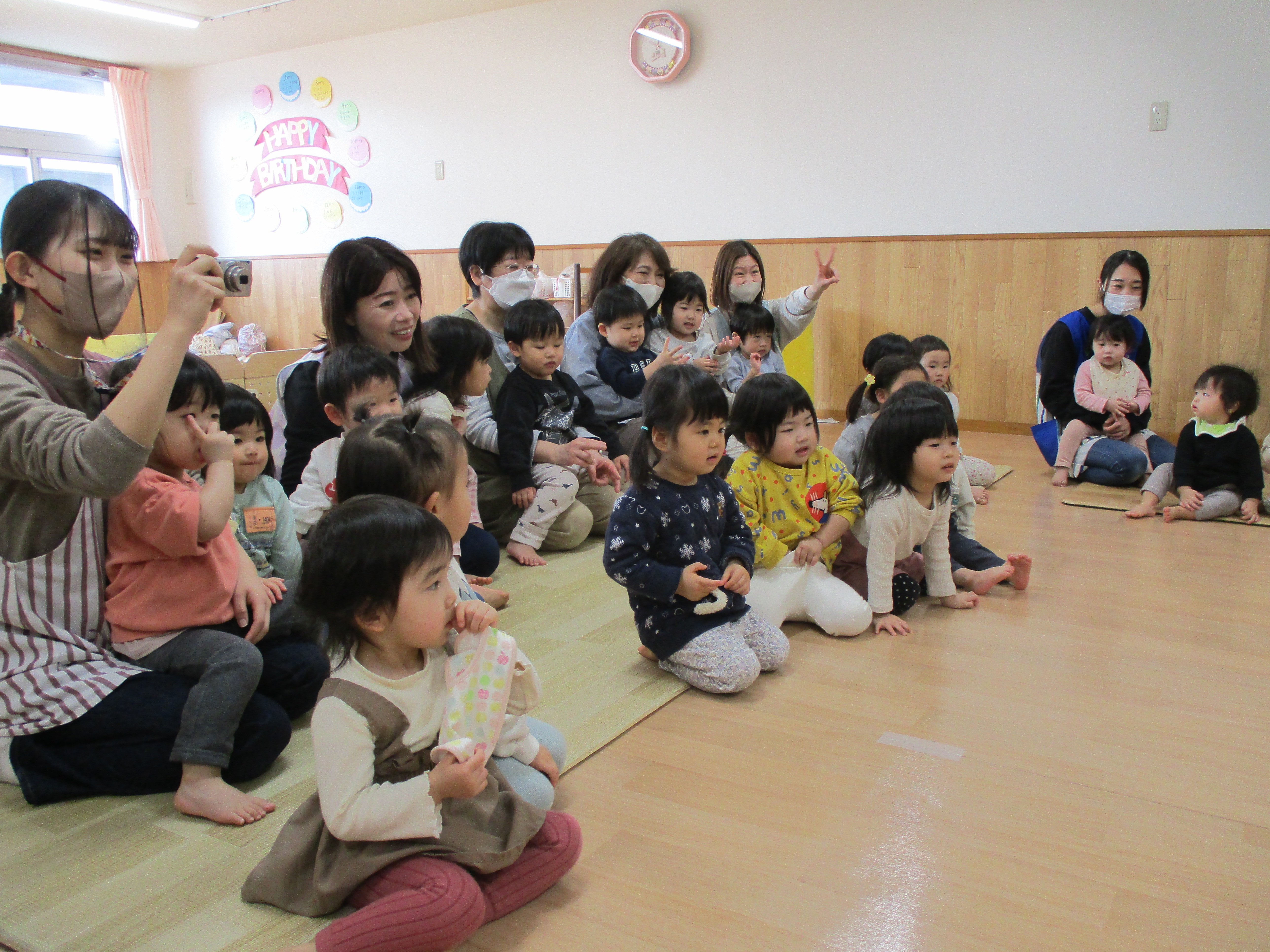 「お片付けして、ホールで遊ぼうか?」の声に、何だか片付けのスピードが速くなりました。ホールで遊ぶこと、大好きですものね。