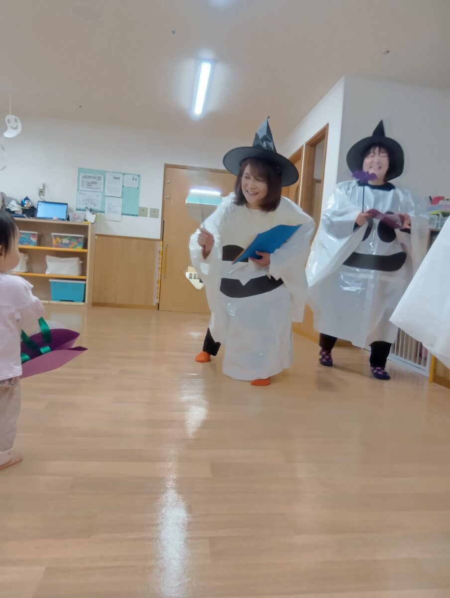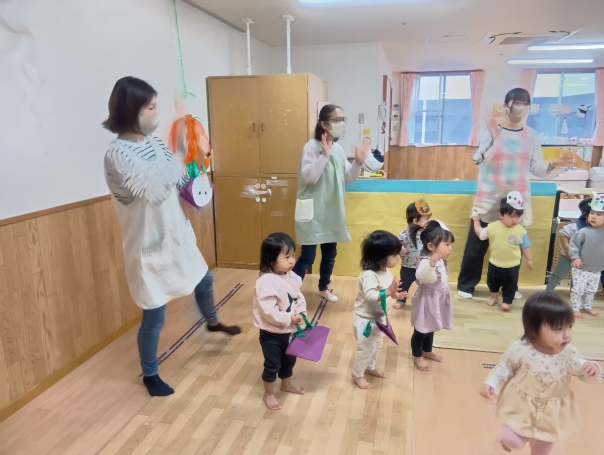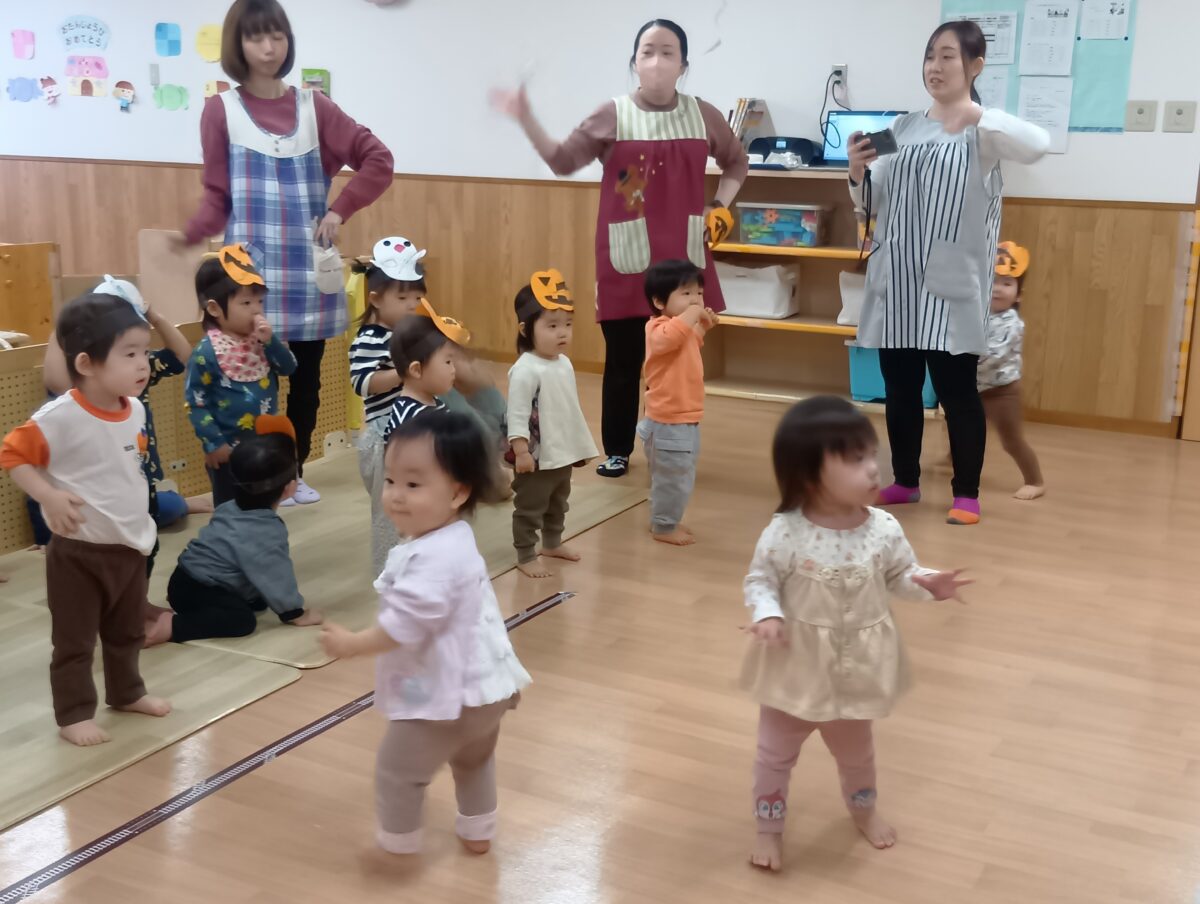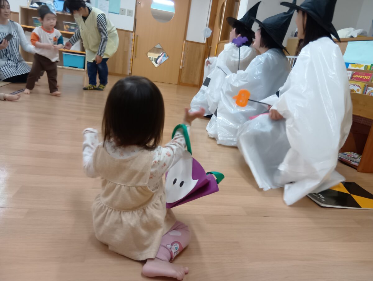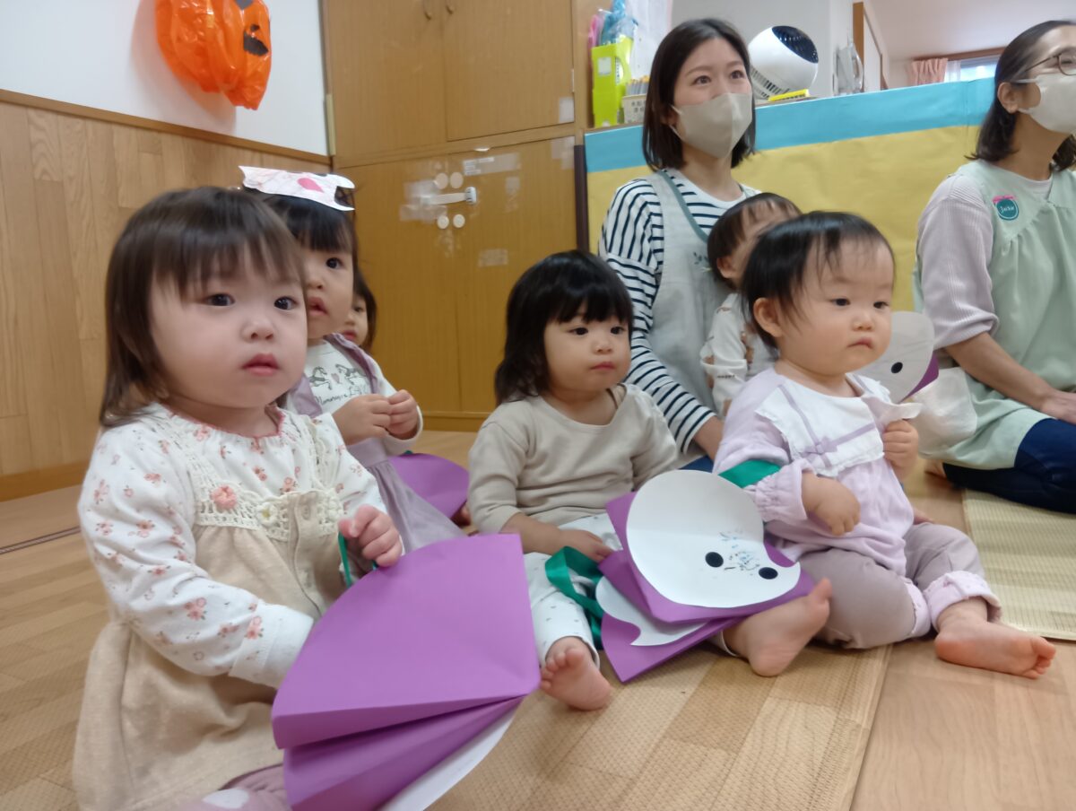 ハロウィンのクイズも楽しく、じーっとよく見ていたりクイズに答えるかのように「はーい!」とお返事をしている子もいましたよ。
