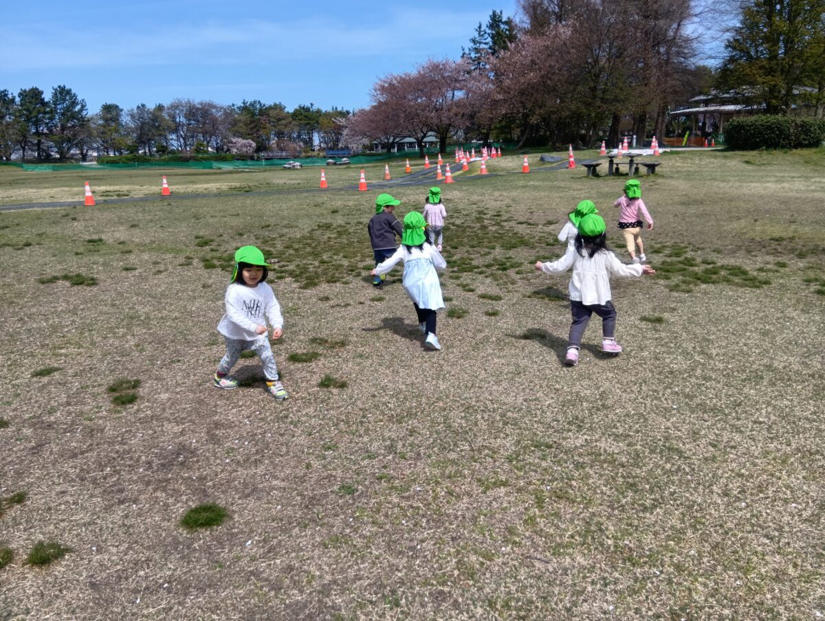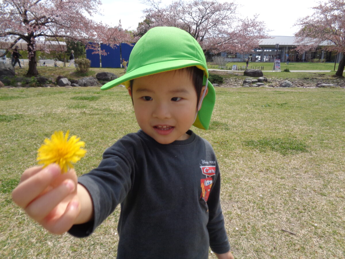 「先生おいかけてー!」「鬼ごっこしよう!」と子ども達は元気がいっぱい。たくさん走り、休憩がてら歩いているとたんぽぽも発見しましたよ。
