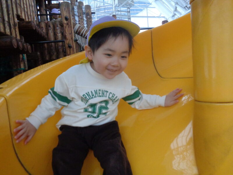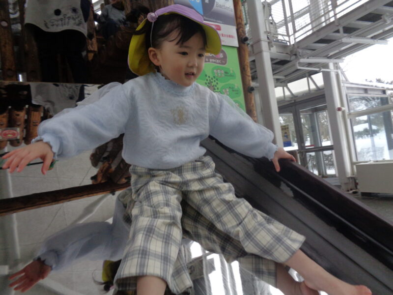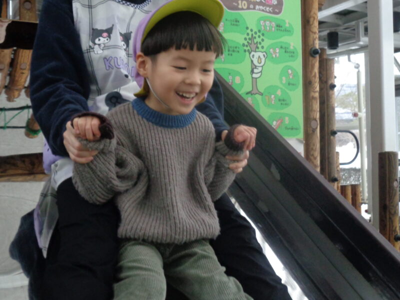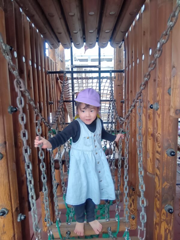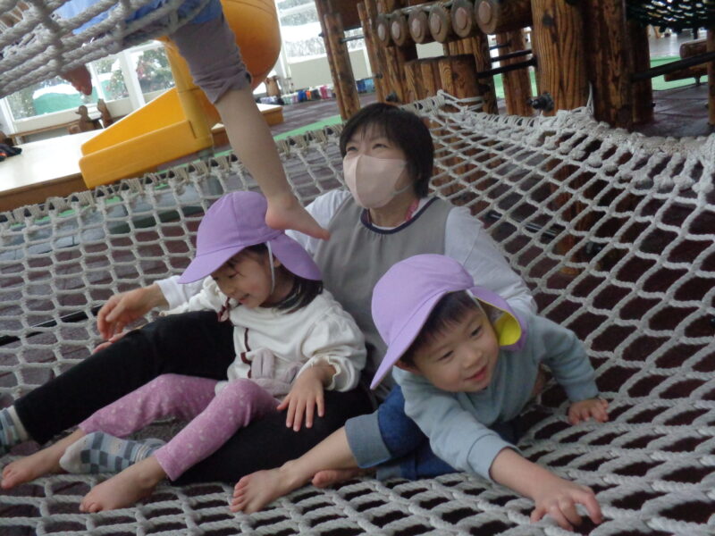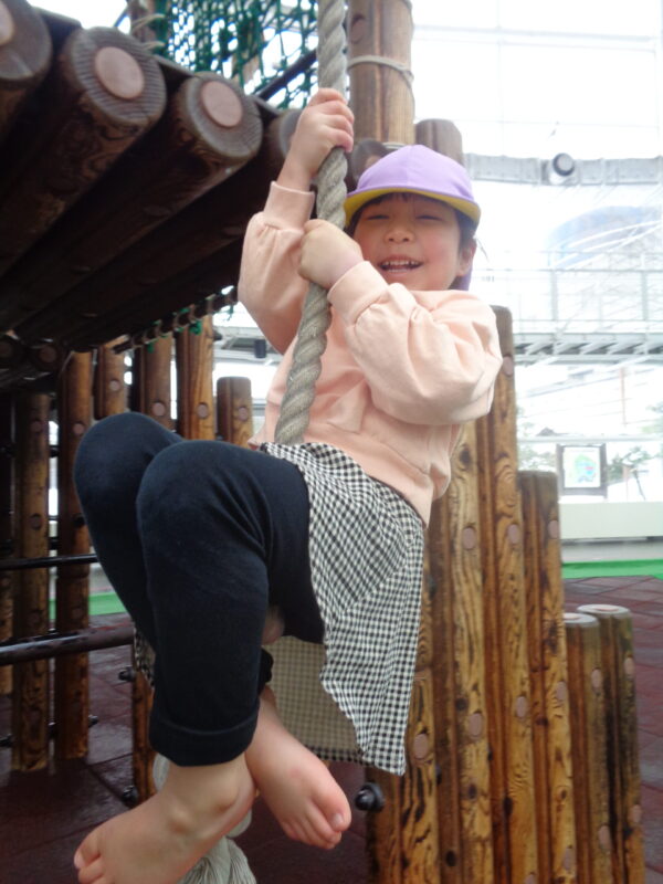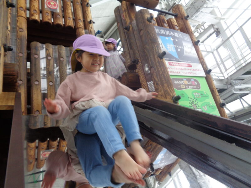 ところが、ふるさと村の大きな遊具に苦戦する子どもたち。高い場所へと上がるのが怖くて「こわい~」という子もちらほら。保育者と一緒に遊んだり、平気な子と一緒に遊んでいるうちに怖がっていた子も徐々に遊具に慣れてきている様子が見られました。次第に友だちと一緒に遊ぶ様子が見られ笑顔も見られていましたよ。
