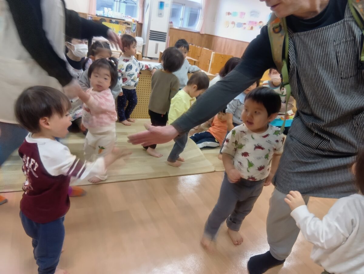 今日は英語あそびがありました。久しぶりのベヴィン先生でしたが、ひよこ組のお友だちは嬉しそうにご挨拶のタッチをしていましたよ。