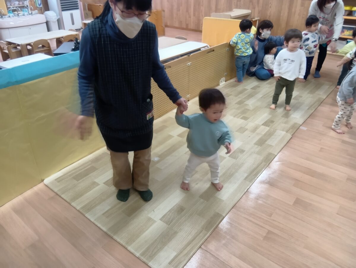 保育者と手を繋ぎお部屋の中を歩いたり・・・