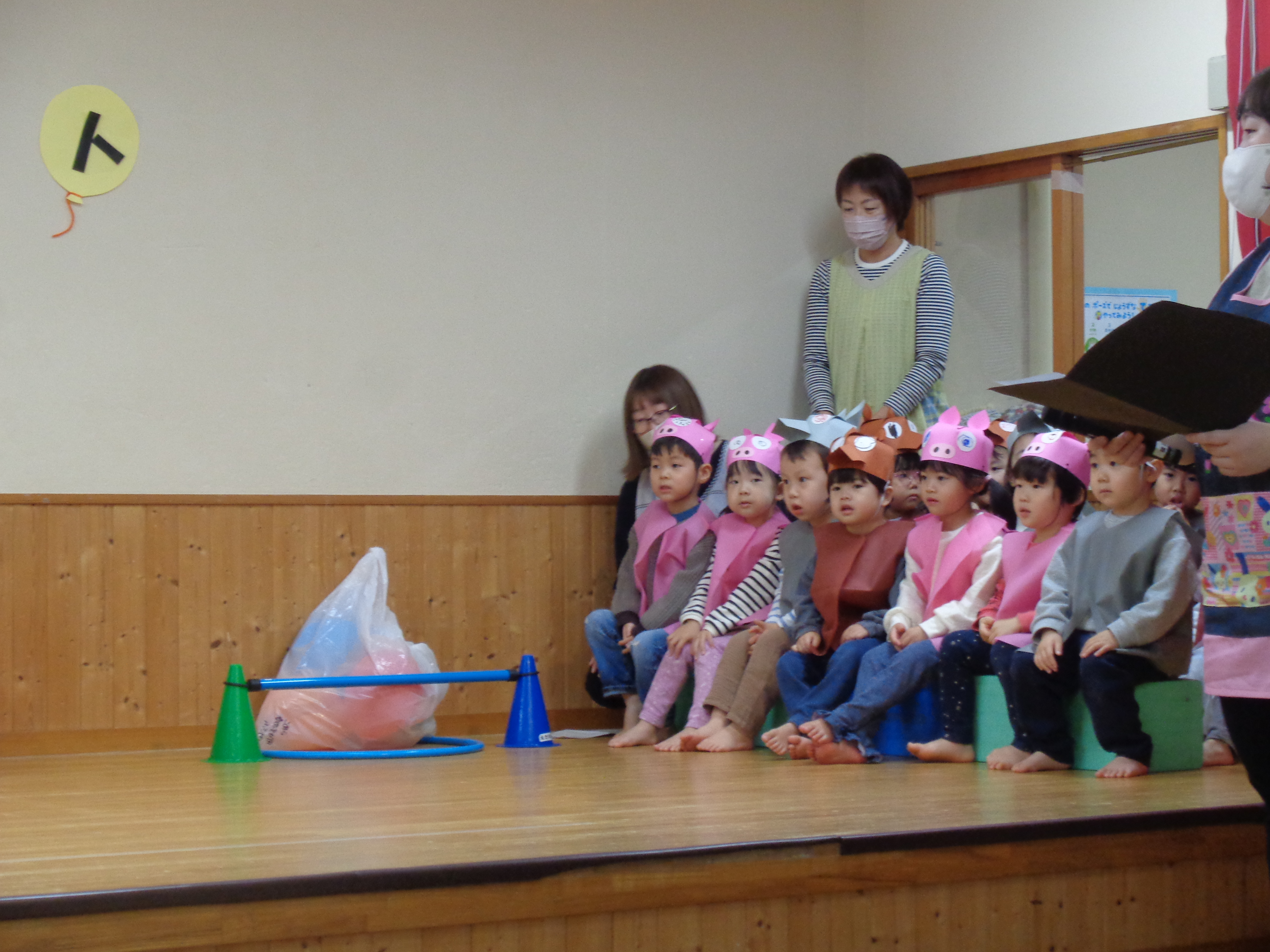 今日は、発表会のリハーサルがありました。ぱんだ組の子どもたちも衣装を身に付けて、本番と同じようにステージに立ってみました。