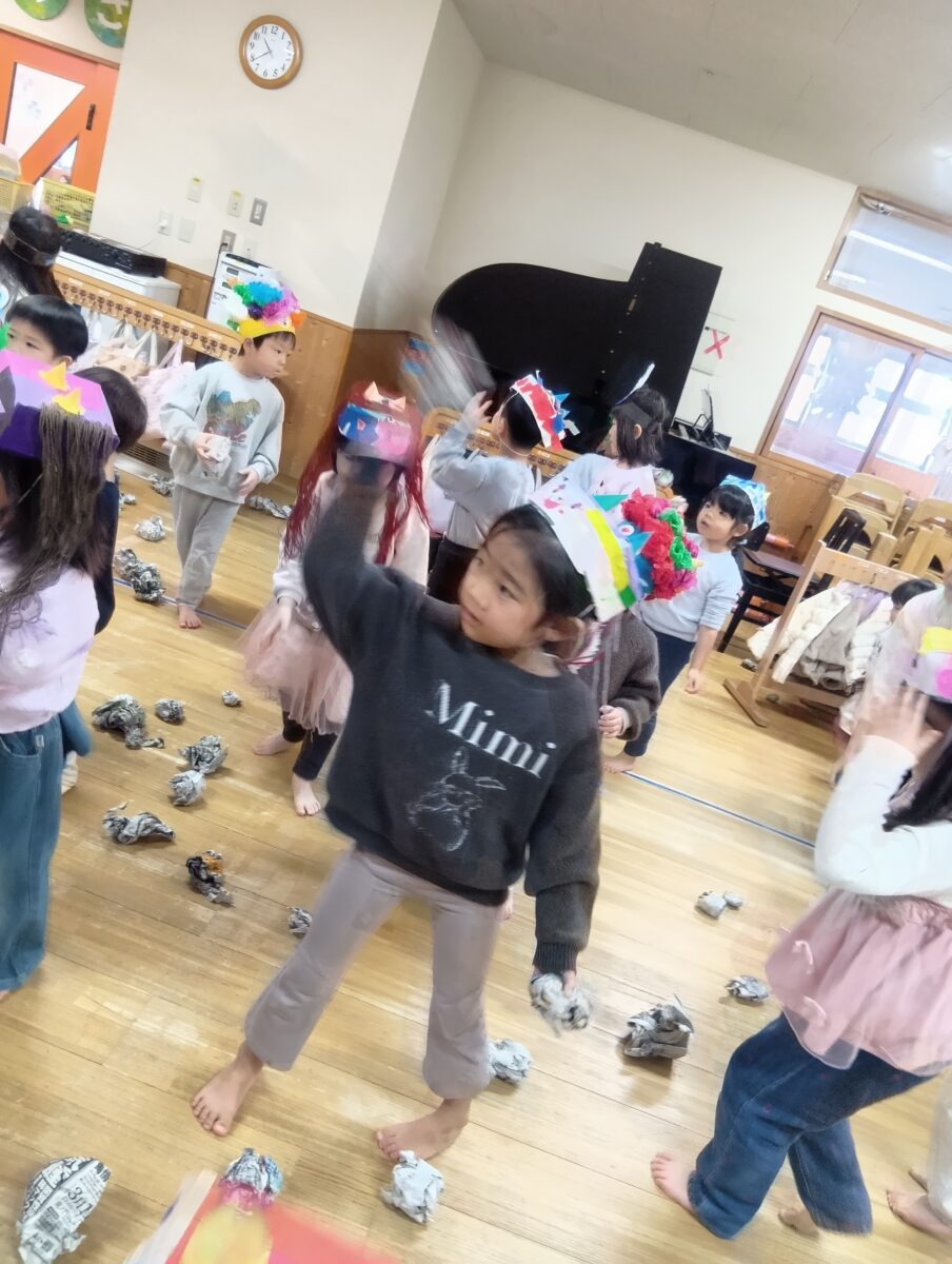 以前みんなで新聞紙でつくった豆を頑張って投げました。