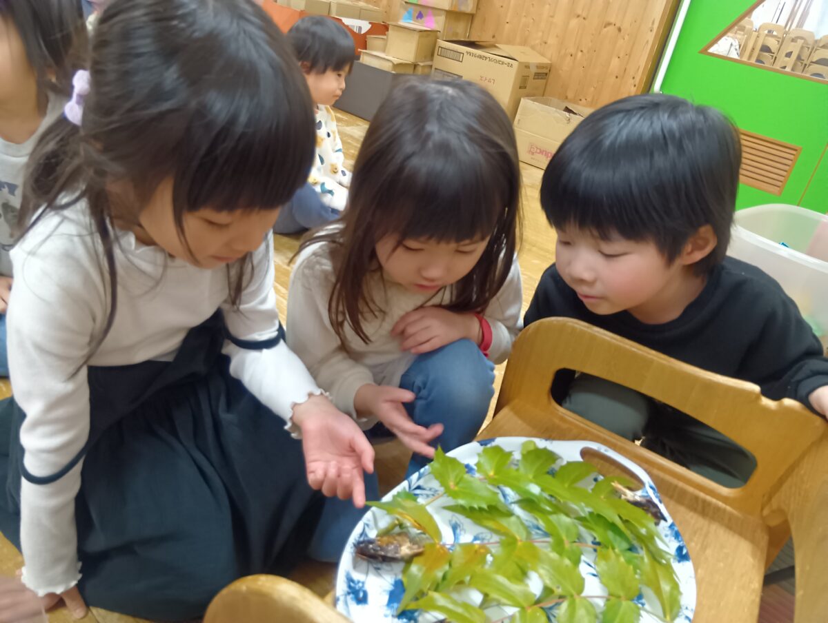 豆まき会の後は保育室に戻って「やいかがし」を見たり触ってみたりしました。