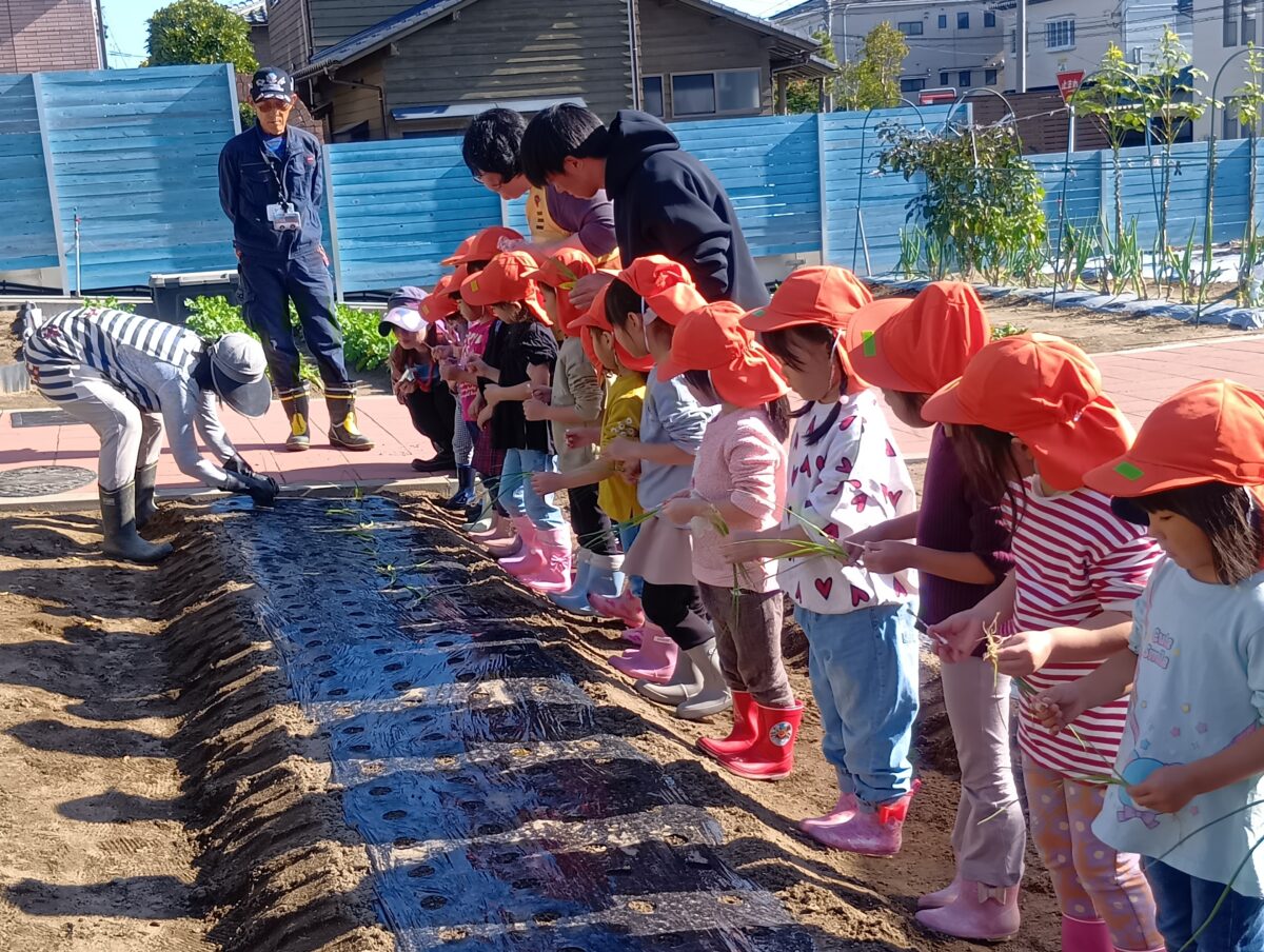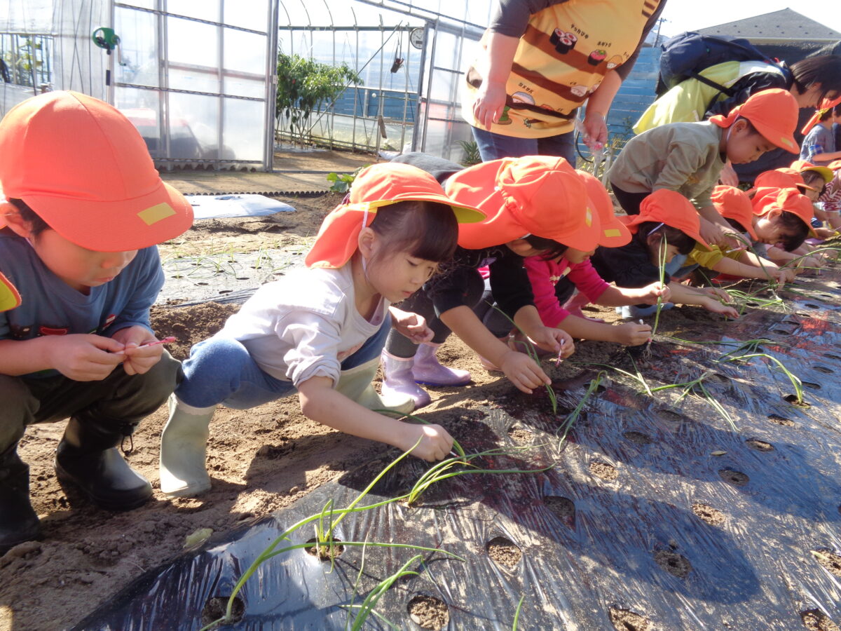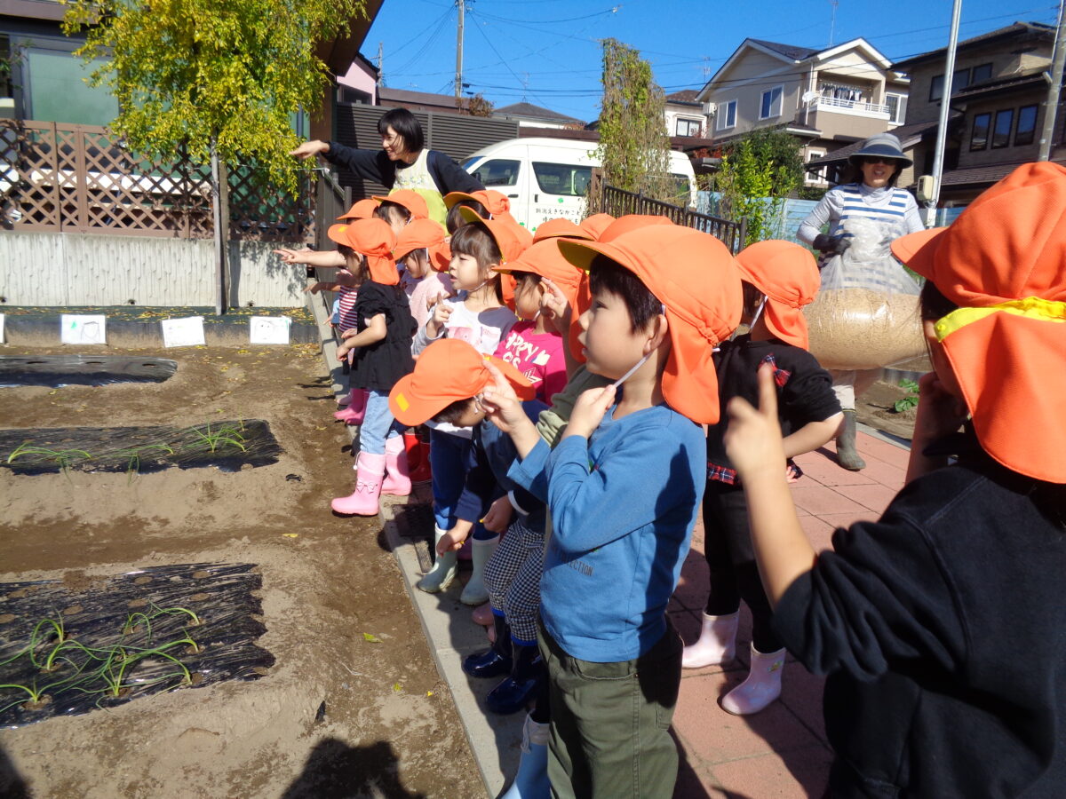 昨日の帰りの会で食育農園の話をきいたり玉ねぎの苗の写真を見たりしていたので、「今日は、畑!」と朝から楽しみにしていた子どもたちです。