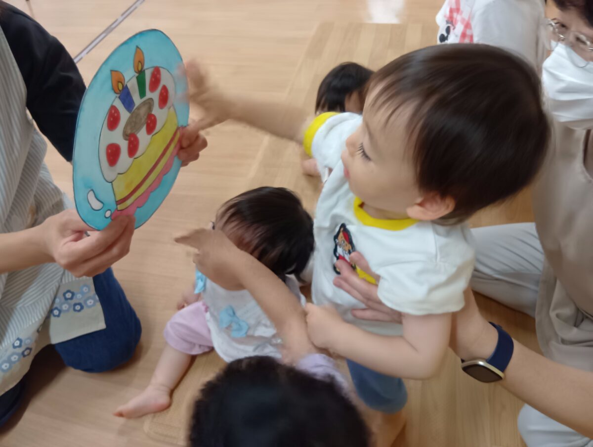 ひよこ組のお友だちも嬉しそうに手を伸ばし、ケーキにタッチをしていましたよ。