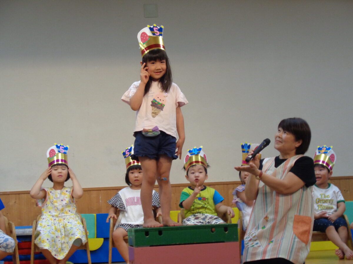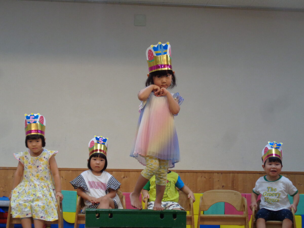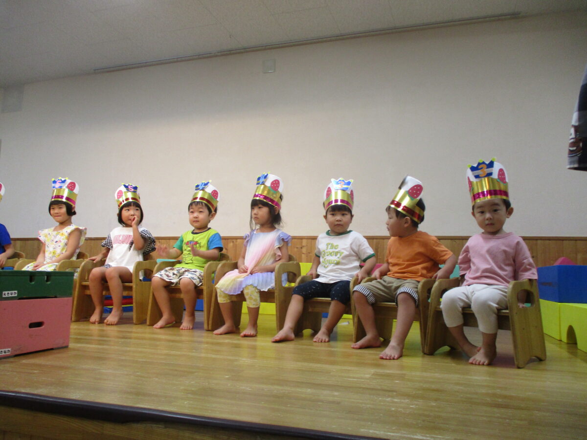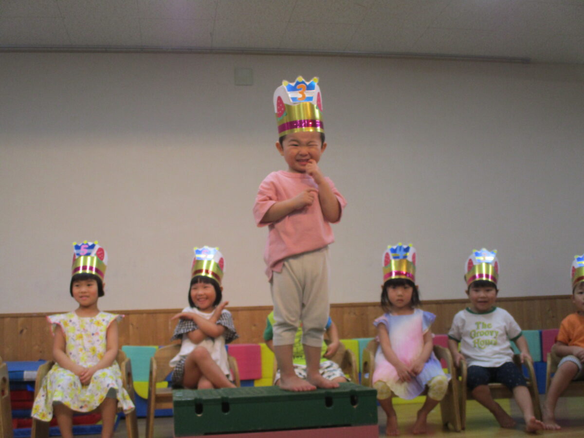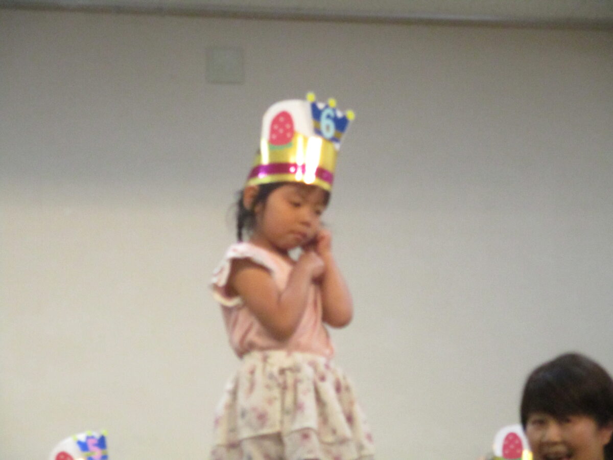 りす組のお誕生児さん1名。キラキラのかんむりをかぶせてもらい、にこにこ笑顔でお誕生席に座っていましたよ。