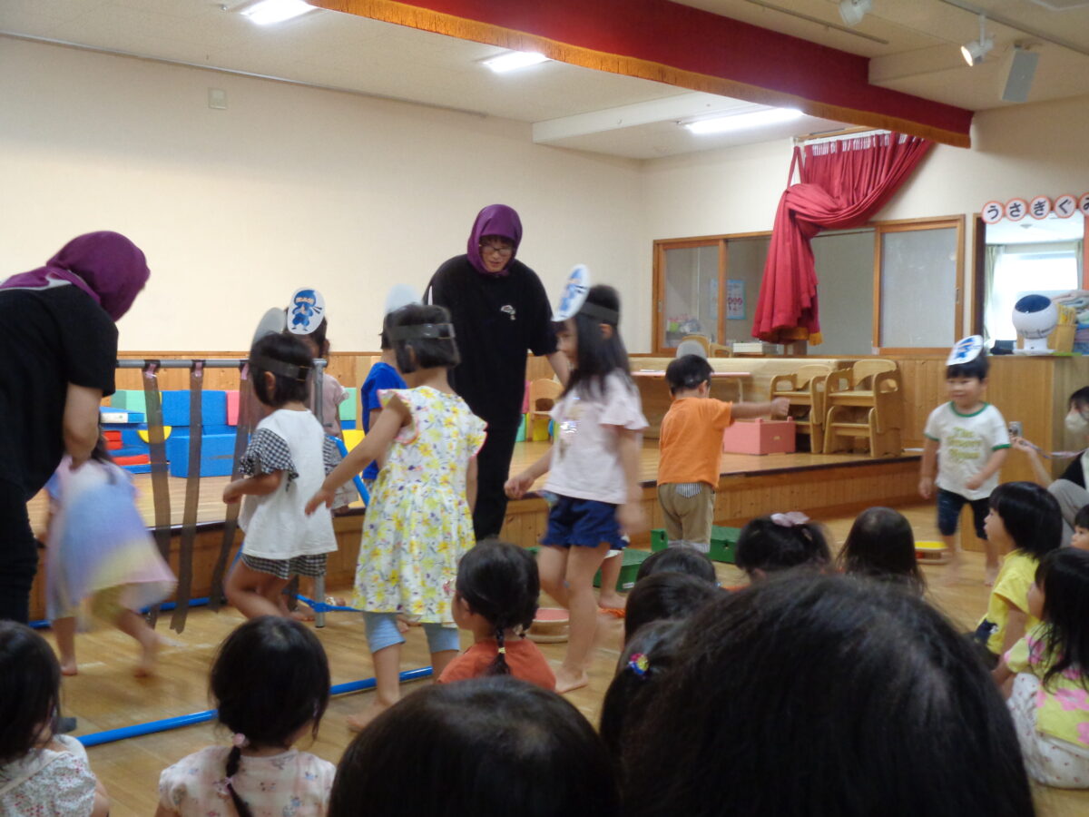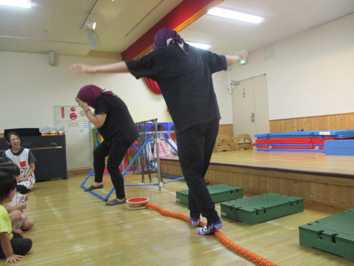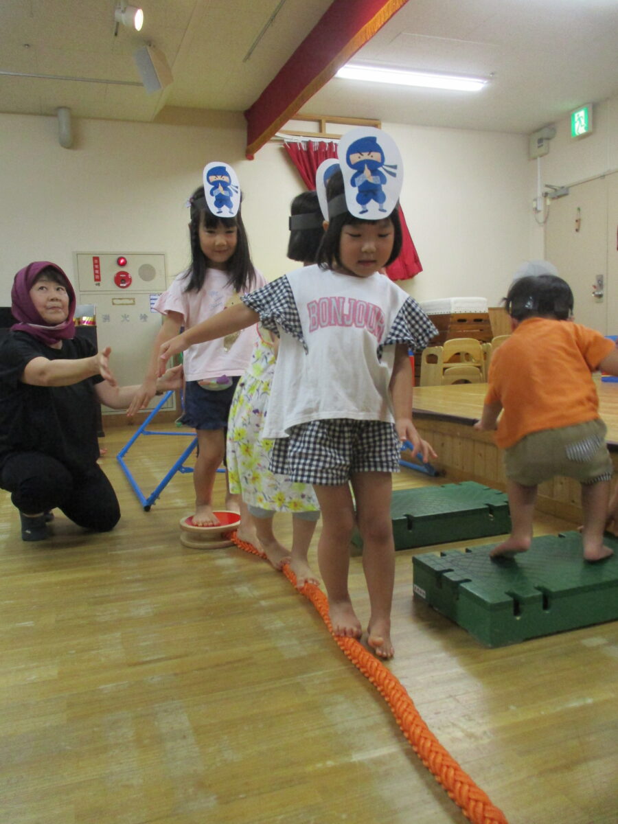 しかし、修行は厳しく、2人の忍者さんたちだけでは、この園の平和を守り切れない…。そこで!!忍者のお面を被ったお誕生日のお友達も修行に挑戦してもらうことに!!